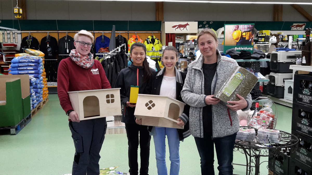 Auf dem Schulhof der Grundschule wird ein Kleintiergehege für 6 Kaninchen errichtet. Und damit sie sich auch richtig wohlfühlen können, nahm Frau Wenzel gemeinsam mit zwei Schülerinnen einen großen Heutunnel, zwei Häuschen und einiges mehr von Marktleiterin Meike Thomas in Empfang.